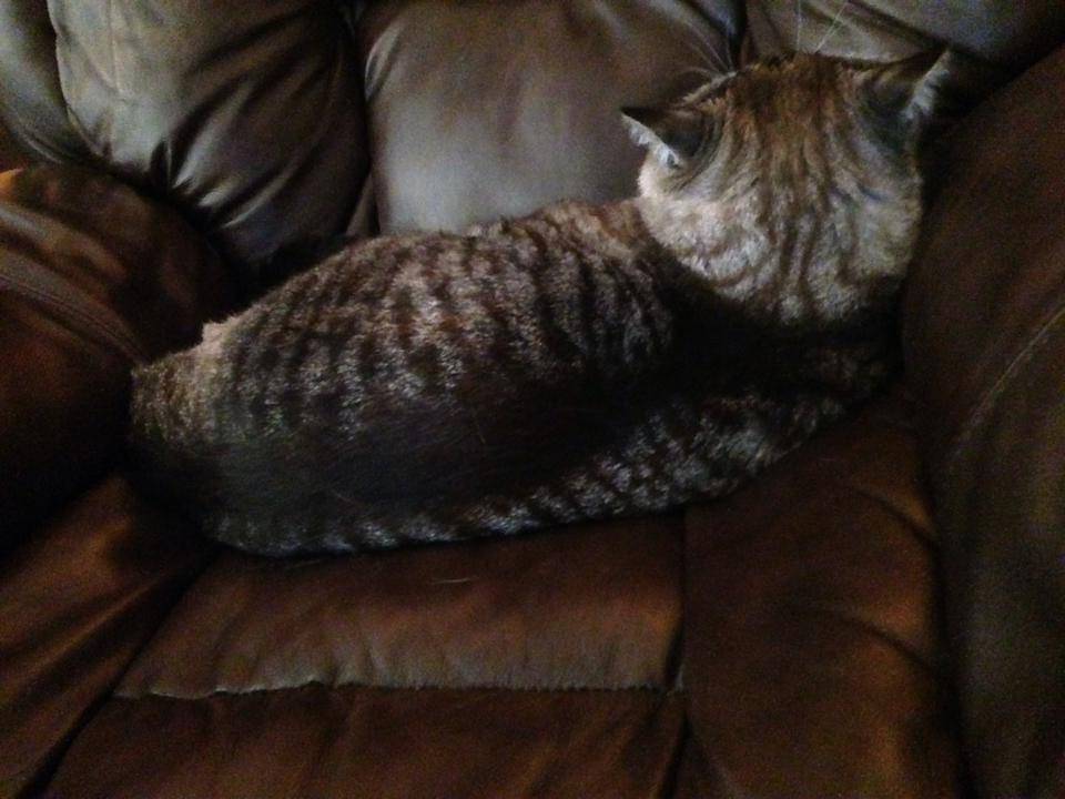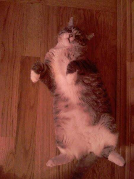 When Boomer is happy, the sides of his mouth actually appear to curl up as if he is smiling! His disposition is always happy!!! So content…. He has the prettiest blue eyes. He must have some Siamese in him because his blue eyes wiggle back and forth but he does not have any of the Siamese meanness in him at all.