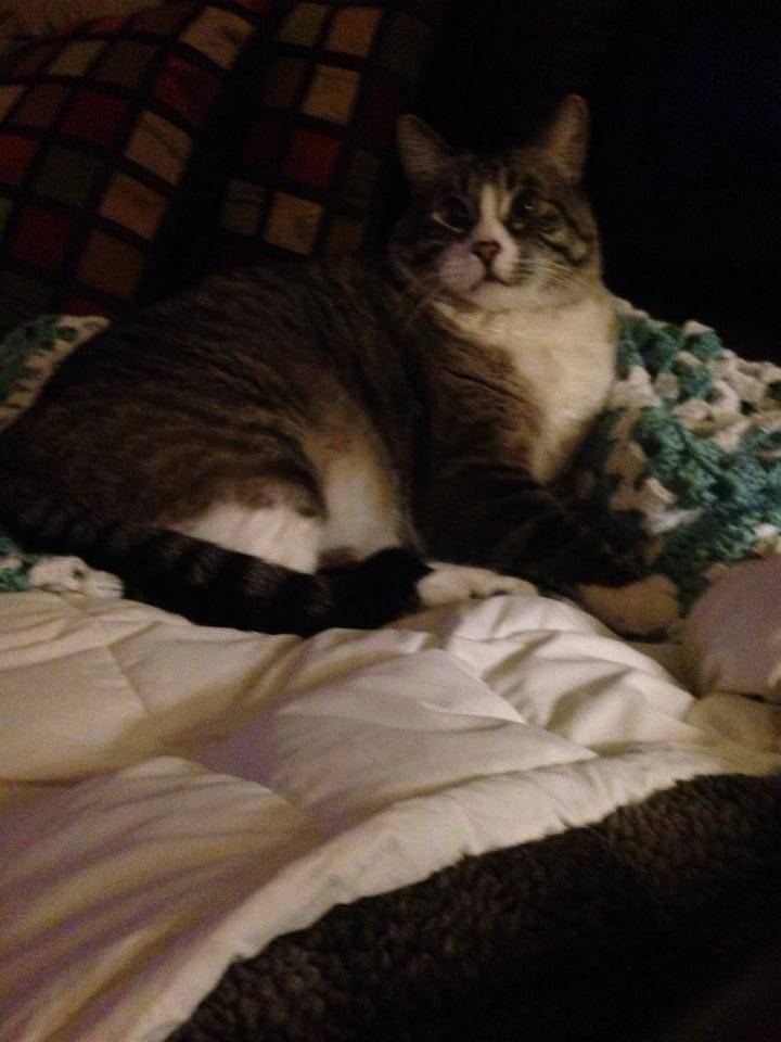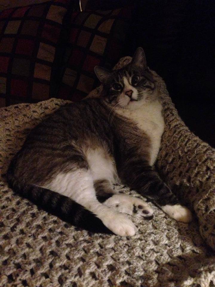 Boomer was found soaking wet and hanging by a weed in a canal in South Weber, Utah, on August 28, 2005. He was just a tiny little kitten at the time and must have wandered away from his new family. My 13 year old son, Brad, and I pulled him out of the canal and took him home.