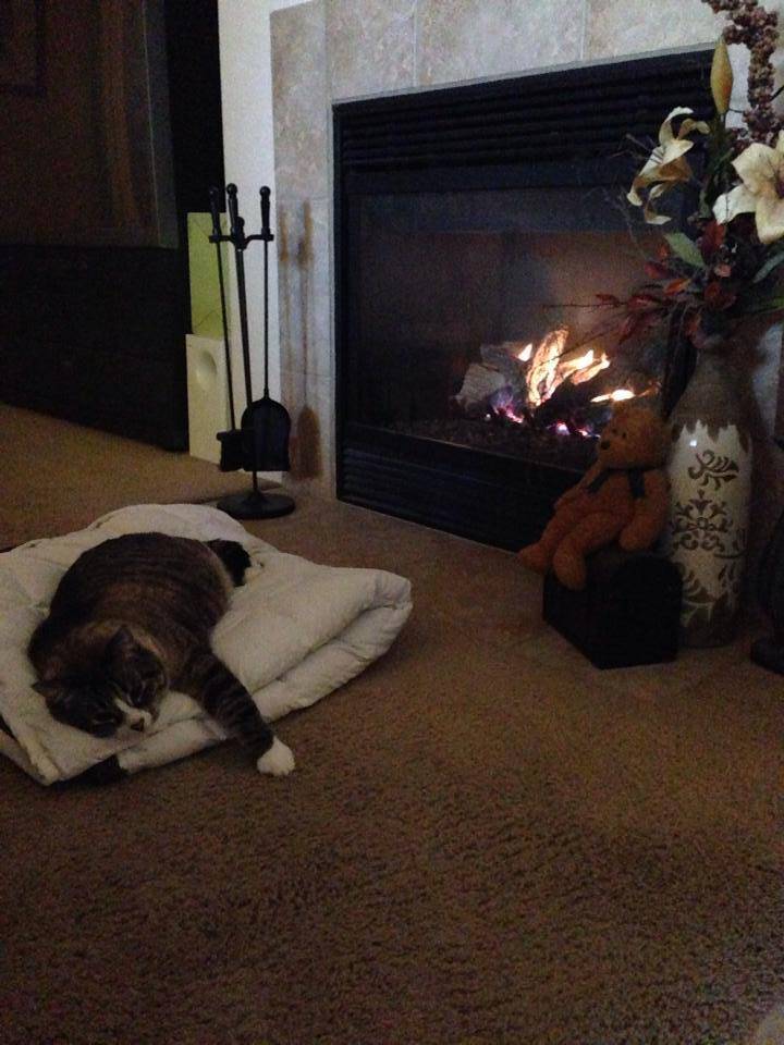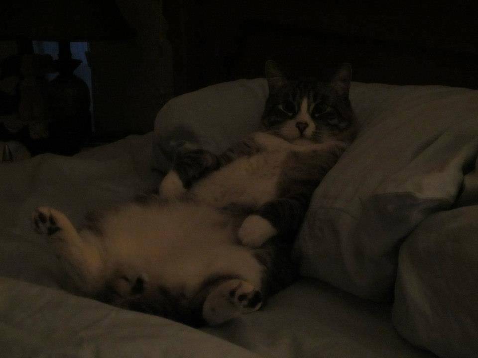 We have two other cats in our home, Thelma and Louise, who are 21 years old. Boomer doesn’t interact with them because he thinks that they are cats and he is a person. He sleeps on the bed and also on the couch and chairs. They have cat beds and the floor. Boomer is a bit spoiled~~~he even has his own kitty stroller!
