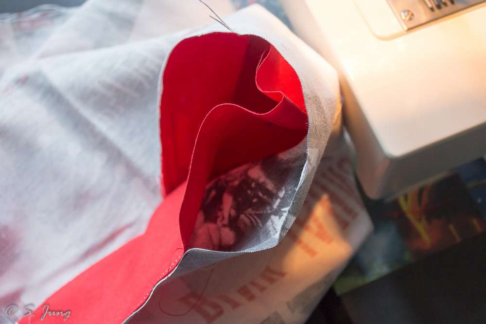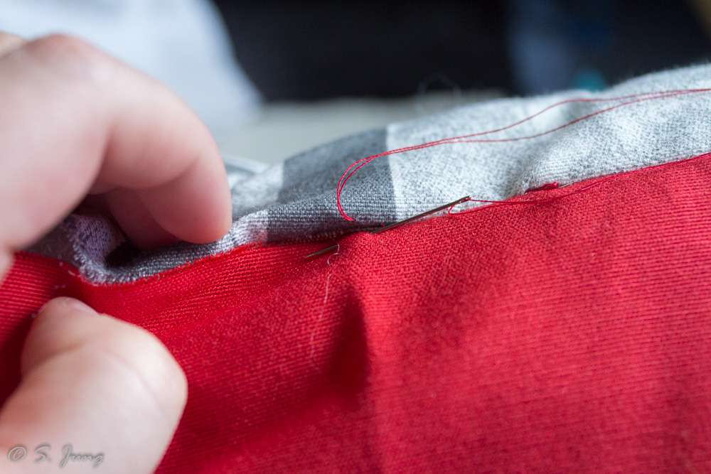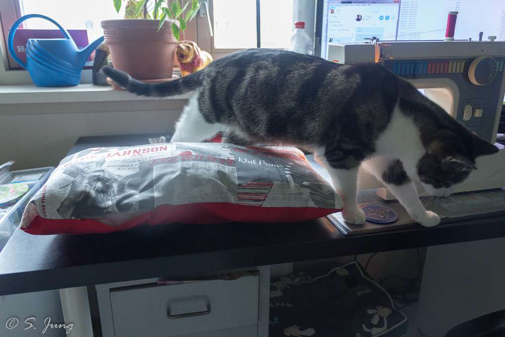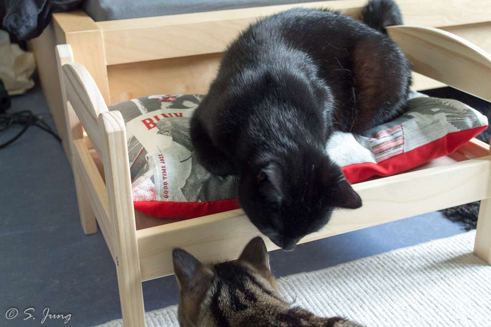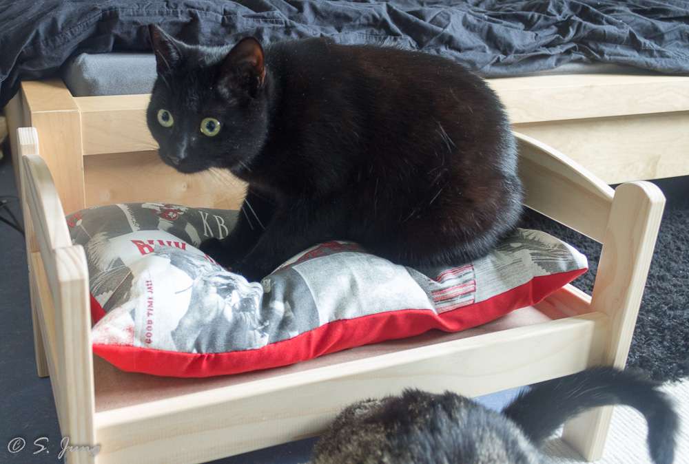 The boys did some first testing and they seemed to like it but it also looked a bit uncomfortable. So the next day I decided to make them a cushion for the bed. For that I took some left over fabric that I still had at home and sewed it together. I left a small opening to turn it around and fill it with the filling of a cheap cushion I bought at the IKEA as well. After filling it up I closed the rest of it by hand. Again the boys were curious and wanted to test the cushion immediately. I then placed the bed at it’s planned location and after a day or so Jack started to use it as his regular hangout point (yes, he is sleeping there while I write this up!)