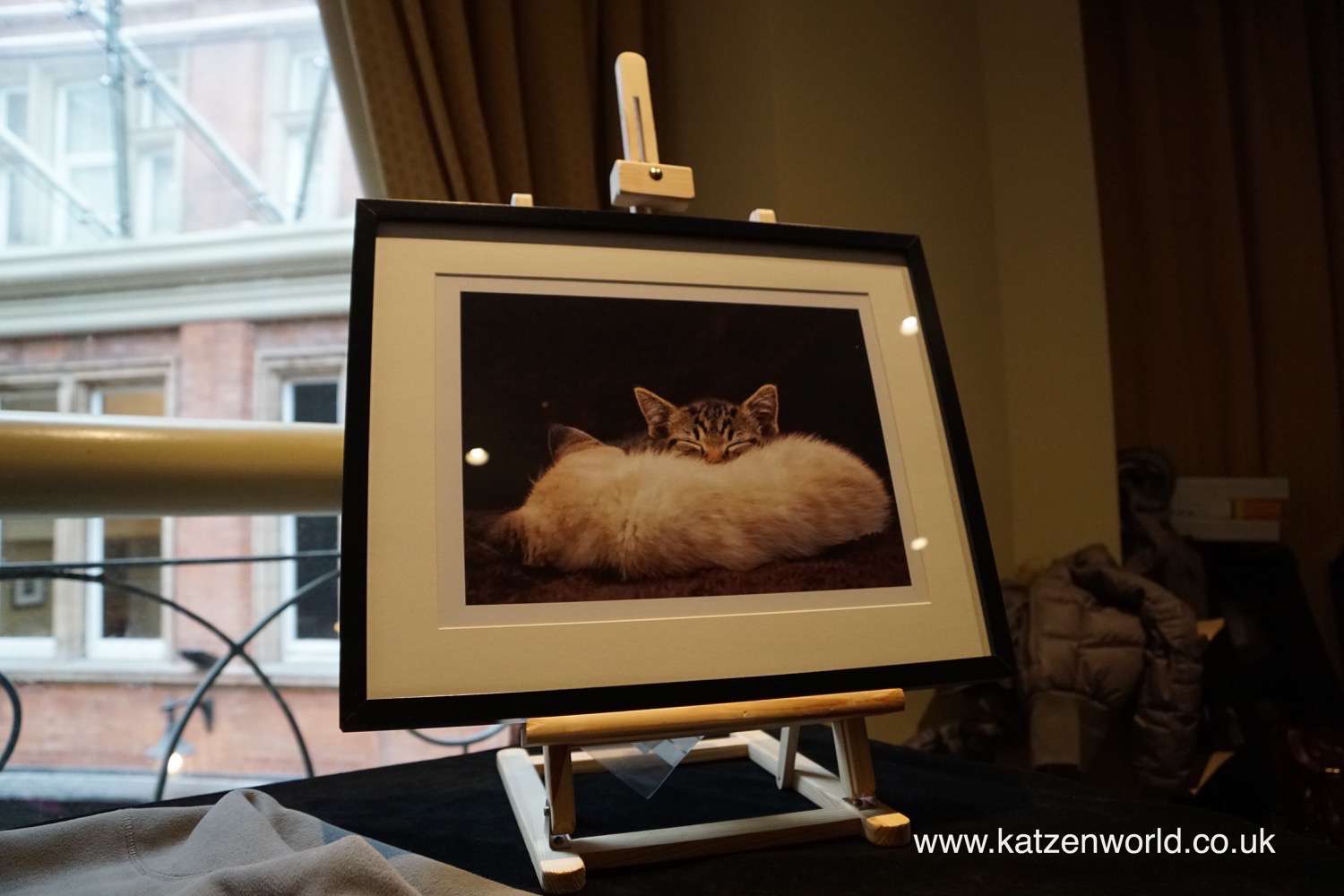 Remember how we said we were coming back to these two kitties? We ended up winning this one in the Raffle! It’s gone up on our living room wall. 🙂