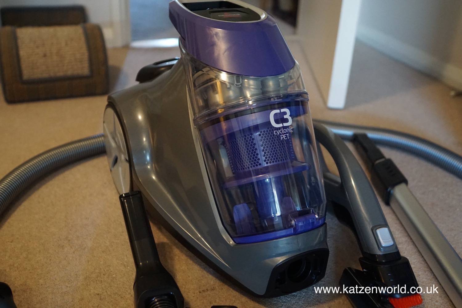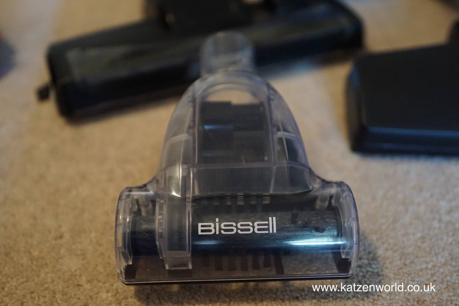 A quick check of the leaflet made it clear that one of the heads is for everyday day cleaning and the other when you need to maximise the cleaner’s performance. The everyday head has a couple of brushes placed at right angles on both sides – something I’ve not seen before. When using the cleaner, it quickly became apparent that this was to brush dirt from the sides into the path of the head. And very effective they were too at getting right up the edges of the carpet against the skirting board. Both heads also have a couple of wheels at the back to make it easier to move the back and forward over the service along with brushes which can be deployed with a flick of a switch by foot for use on hard floors. And unlike a lot of cleaners I’ve used, the C3 has a little slider on the wand with which you can reduce the suction power. A simple but useful addition if you’re cleaning an area with a rug. The third head for the C3 is a small head with air driven roller brush. Ideal for taking care of Oli and Nube’s cast off hairs on the sofa and scratch tree.