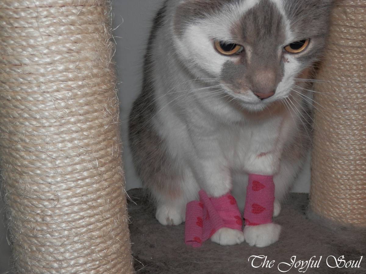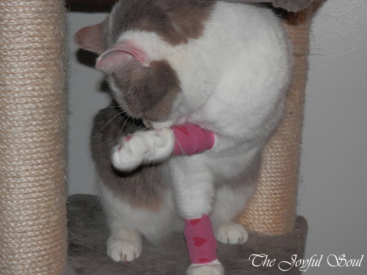 Lola and Elvis both had lovely bandages on their legs after the vet trip. Elvis actually had two, both in pink, and Lola’s was green. They both greatly disapproved of the bandages, and Elvis very quickly removed his. Lola was a bit slower about it but did get it off before too long.