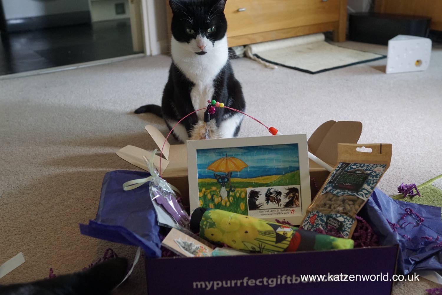 It’s Nubia here today we have some really special for you! It’s called My Purrfect Gift Box and at first both my brother and I thought it was full with stuff just for us! But it was much better than that. It was a box for both our humans AND us! 😀
