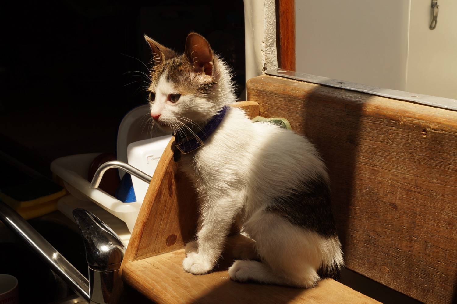 I was most likely born in the little Greek town of Limni, on the island of Evia. I wonder how many brothers and sisters I had? I was found inside the engine of a Toyota 4×4 truck, so maybe I travelled in the truck from somewhere else! I’m very feisty and adventurous, so maybe I got separated from my mummy cat and couldn’t find her, so hid in the truck for safety. I was yowling my tiny head off for simply ages, until I was rescued by the humans. They certainly took their time – they walked away and left me to start with, then the guilt kicked in and they came back a few hours later to rescue me, quite right too! They took me to their yacht, Fandancer, moored in the harbour. I was unceremoniously dumped in the galley sink and washed with detergent twice – no-one knew what colour I actually was, as I was covered in engine oil and dirt.
