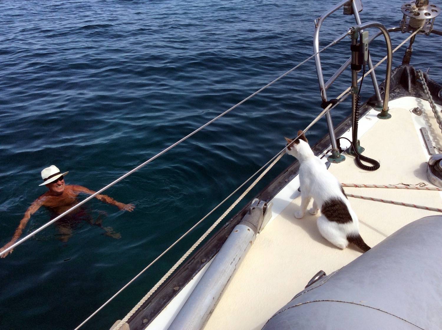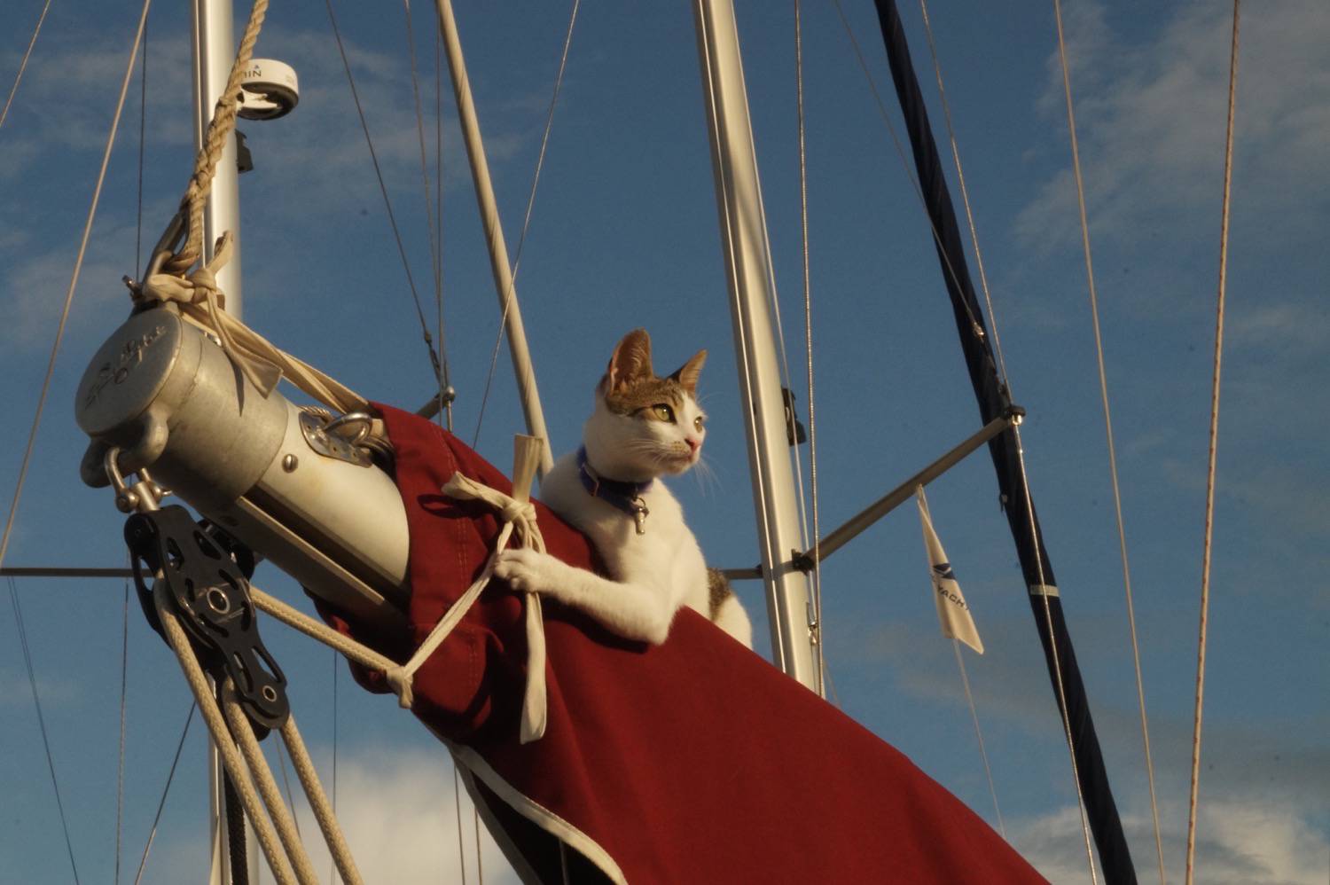 I’ve had so many adventures while living on the boat – during the day when we are sailing I sleep in the corner of the cockpit on a cushion, or in a box in the wheelhouse shelter. In the evening when it gets dark, I like to run like crazy all over the boat, from bow to stern, on the sun canopy, and jump onto the sail covers. I like hunting for moths and cicadas. As soon as we get into a harbour, I want to go and explore! We often moor stern-to, and once I jumped off the stern too early as I misjudged the distance. I belly-flopped into the water – most undignified! If we are at anchor, I can’t go ashore, and get very cross when the humans go off in their dinghy without me. I yowl loudly at them and lean right off the swim platform so they think I’m going to fall in. Sometimes the male human feels sorry for me and takes me ashore in the dinghy so I can have a run about on a beach or rocky shore. I’m very clever and will come back when I’m called.