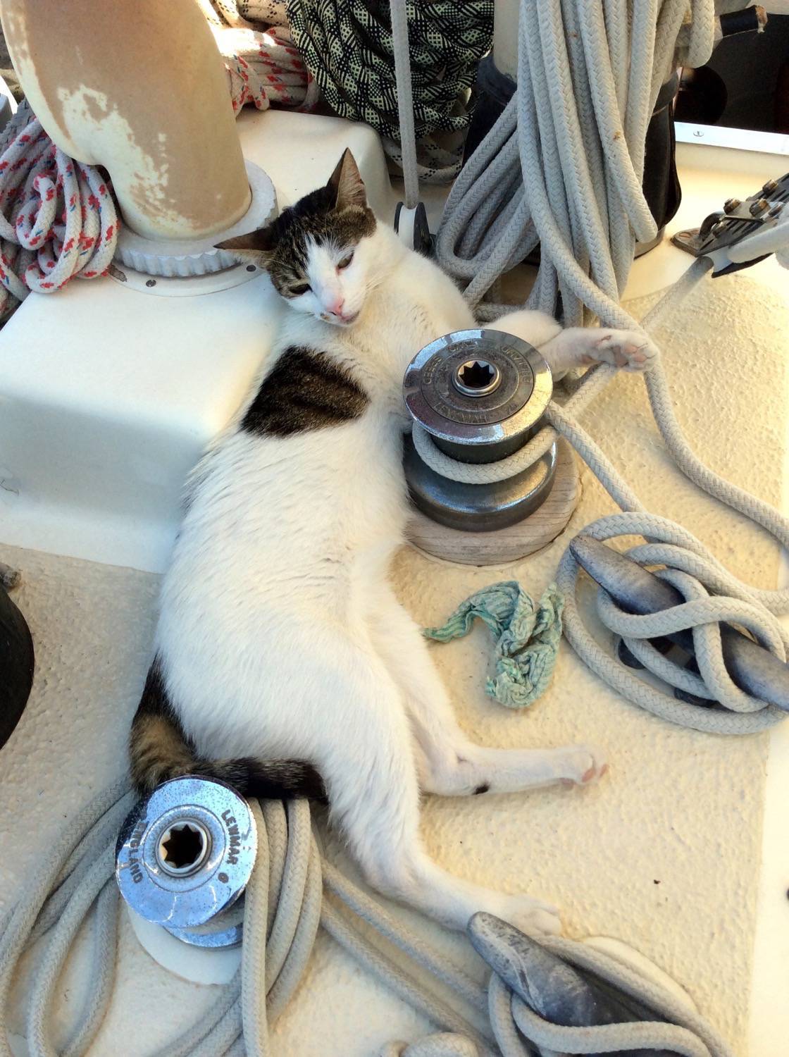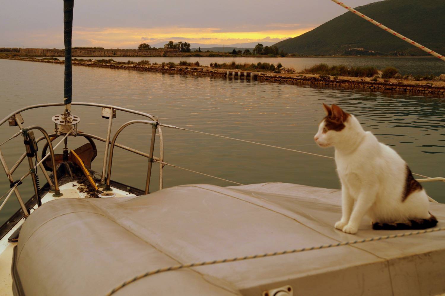 I’ve had a few narrow escapes – once I climbed too far up a tree and I was VERY scared. Lots of people stood round the tree, scratching their heads and making suggestions. When they went away, I came down by myself, very cautiously, and ran back to the boat as if nothing had happened. Another time, in Zakynthos harbour, I went ashore just as it was getting dark, and stayed out ALL night! The humans were getting terribly worried and spent half the night looking for me, and all the next morning. They feared the worst, but I was fine, I sauntered on board at midday and slept for a very long time! No one knows my secret of what I got up to that night….