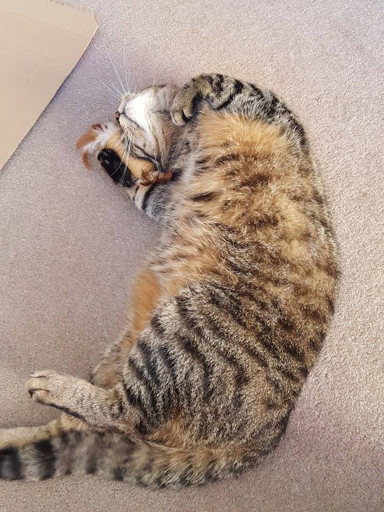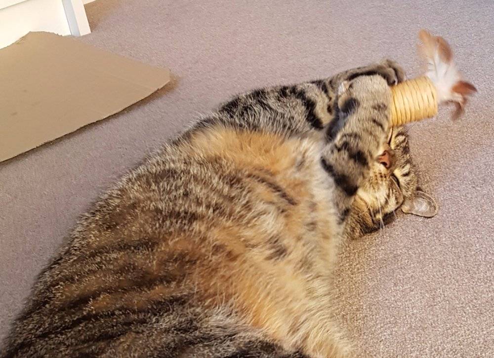 Yeah, so I look kind of silly rolling around the house like this, but who cares. After playing with it I always like to lick the feathers, as I would with an actual prey (if only……)