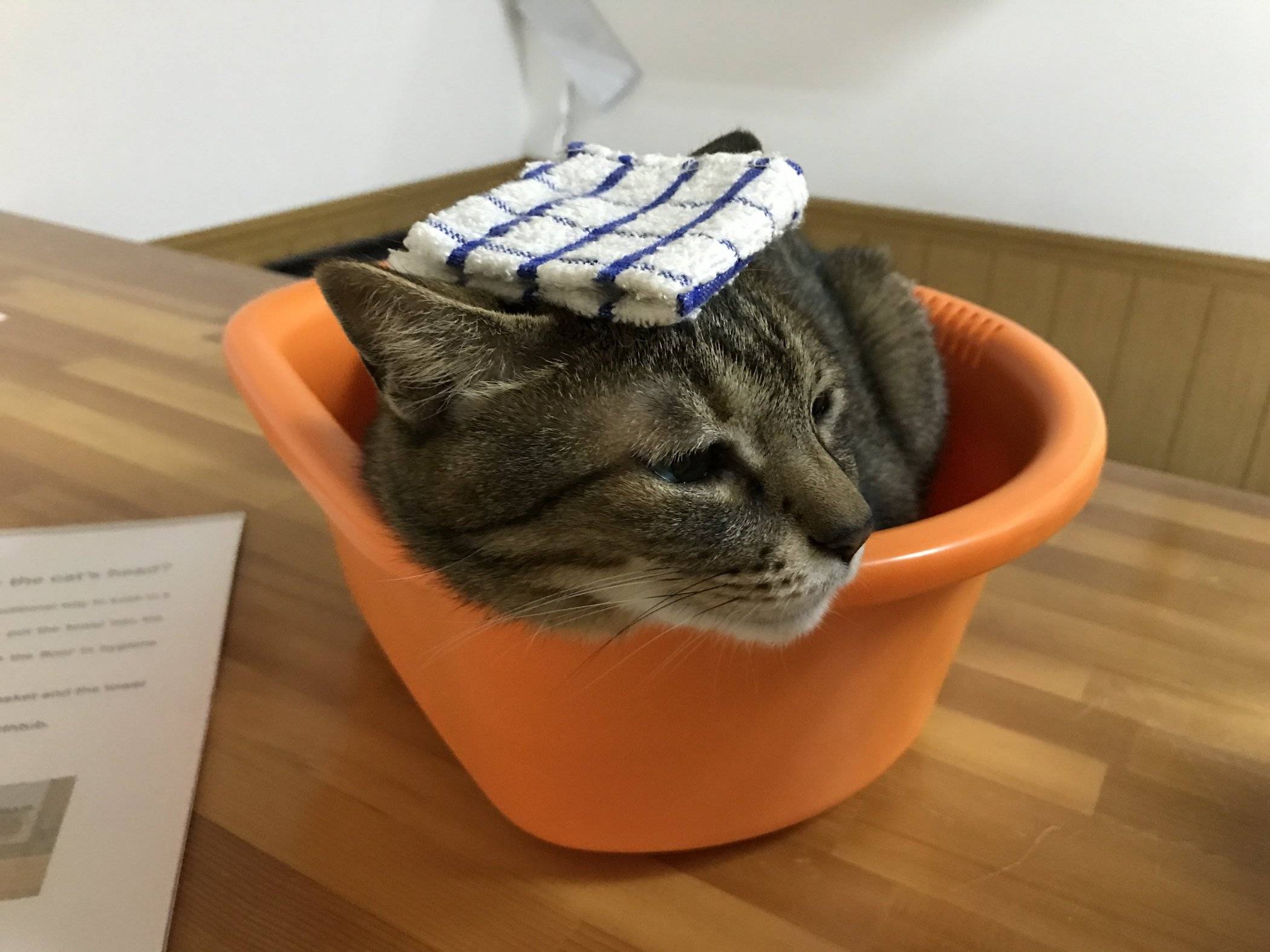 Then, I met the lovely ladies behind the desk. First, they were very kind and made me feel welcome by seating me, taking my drink order (I had an iced tea) and then giving me some information about the cats, including why the cat in the orange tub has a towel on his head? Answer: because Japanese people do the same when going to Onsen, Japanese baths. They went out of their way to cater to their guests, but it was clear they love the cats first and foremost.