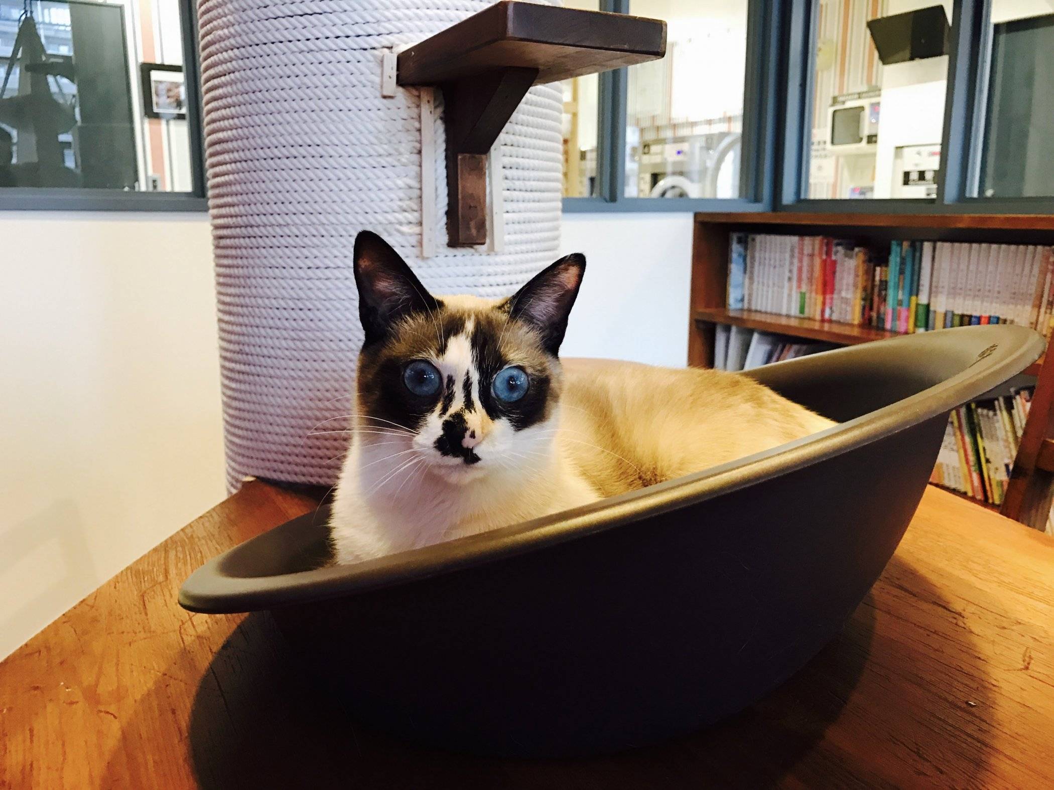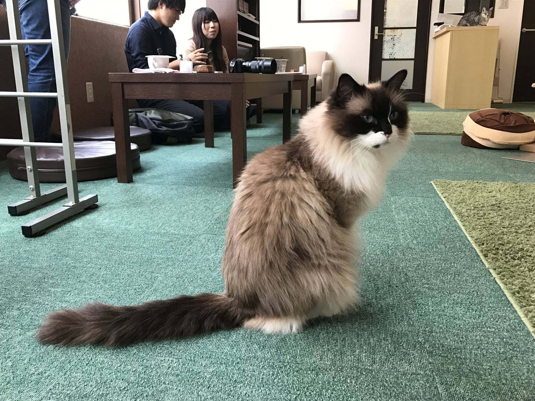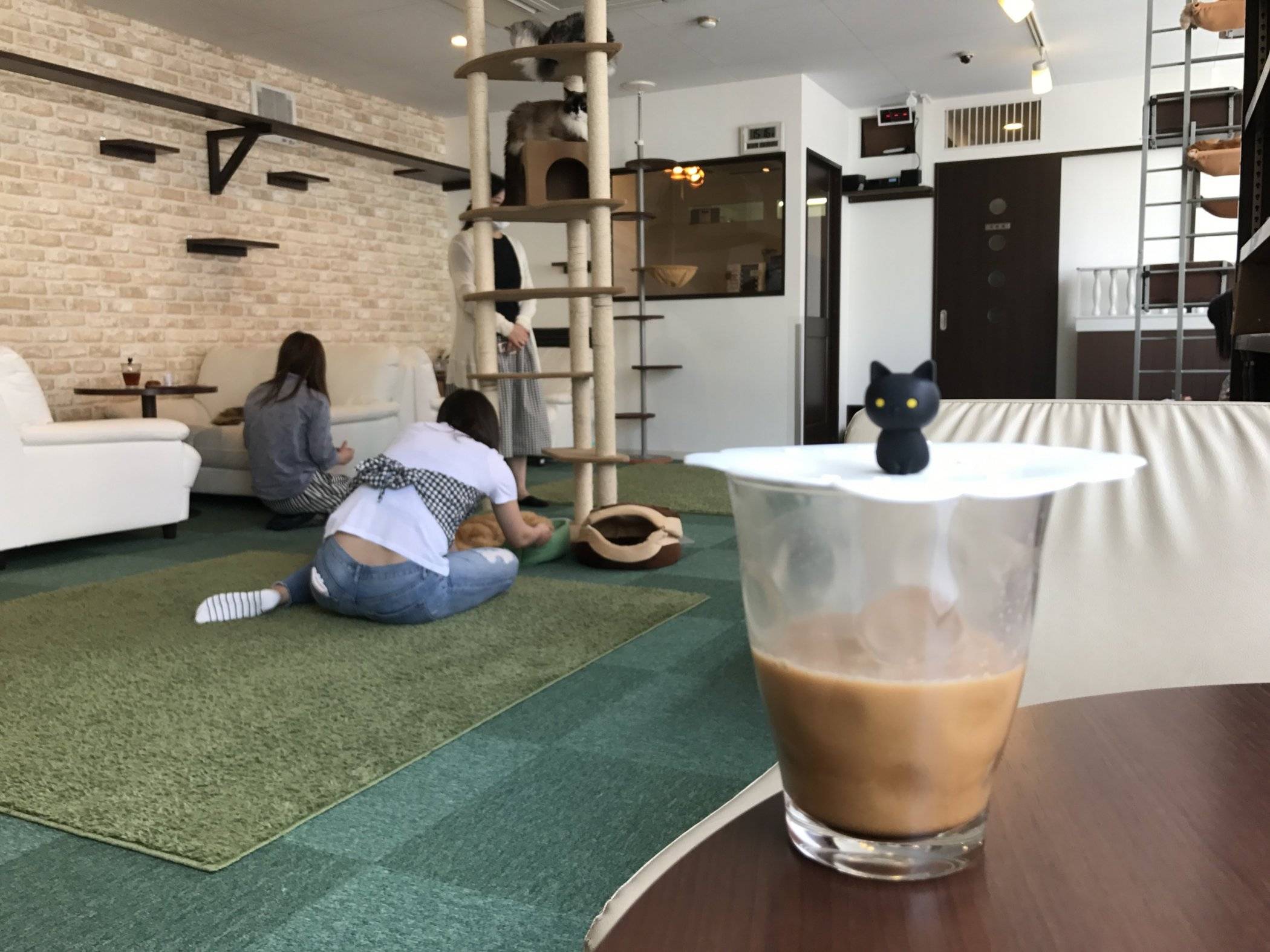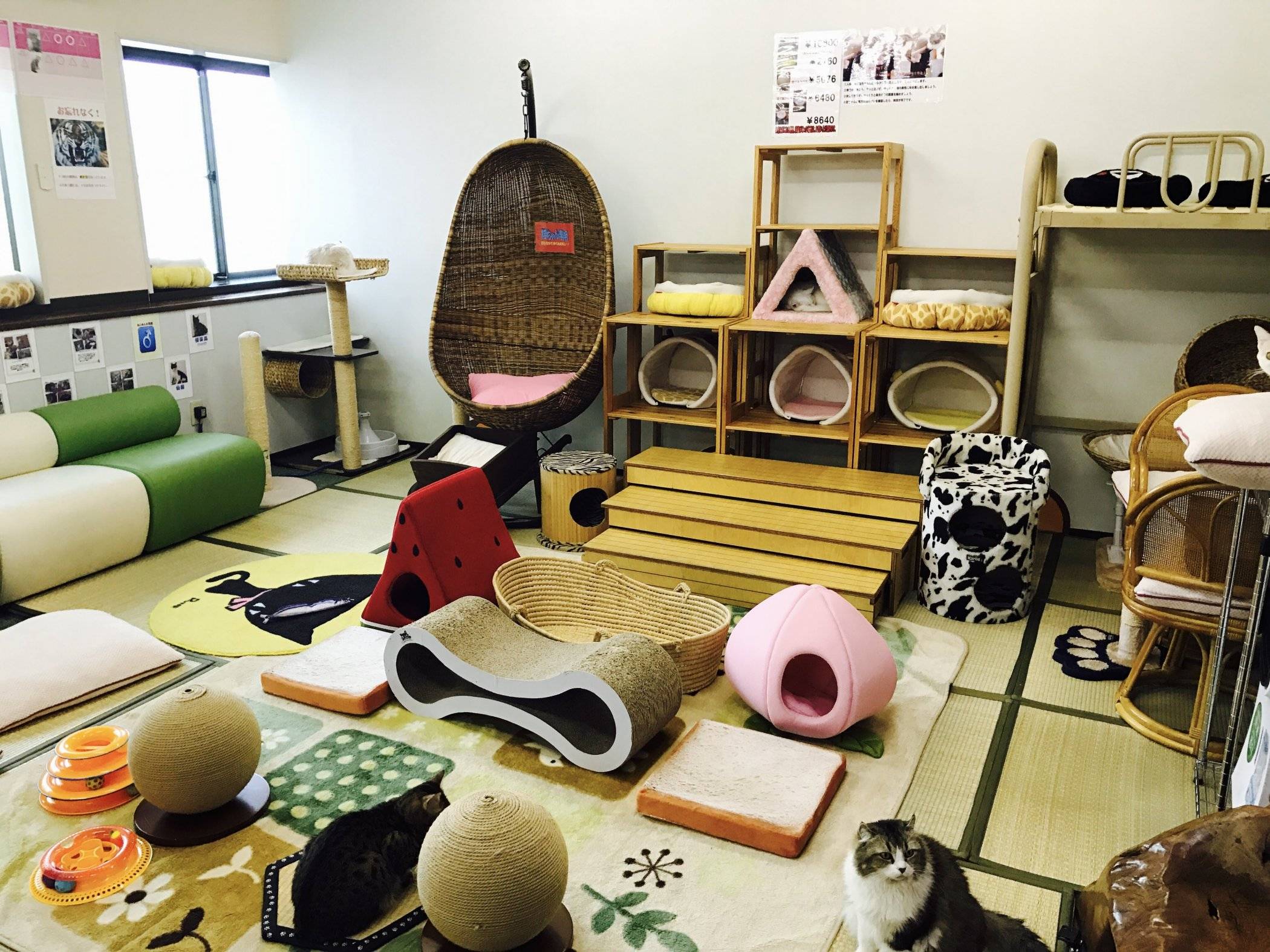 Clean and tidy, there are three rooms to satisfy every cafe need- a lively cat play room with lots of toys and climbing equipment, a quiet side room, and a sitting room with a long table and window where you can enjoy a beverage and observe the cats surveying the outdoors.