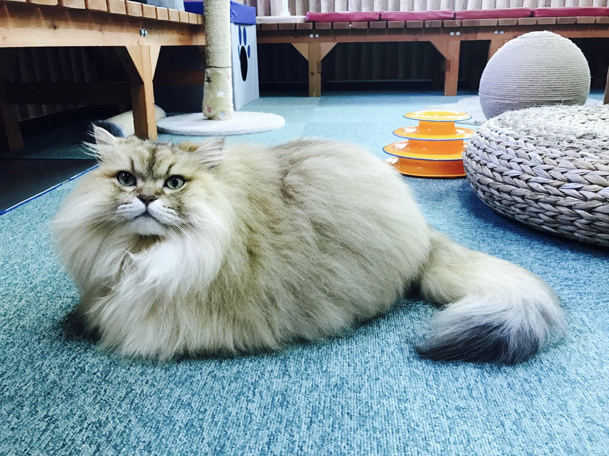 First, the big, open space is brand new and beautifully designed. The teal carpets, white and tan leather couches and dark wood tables make for an appealing combination. The cat equipment is thoughtfully and tastefully incorporated so that it enhances vs. cluttering the space.