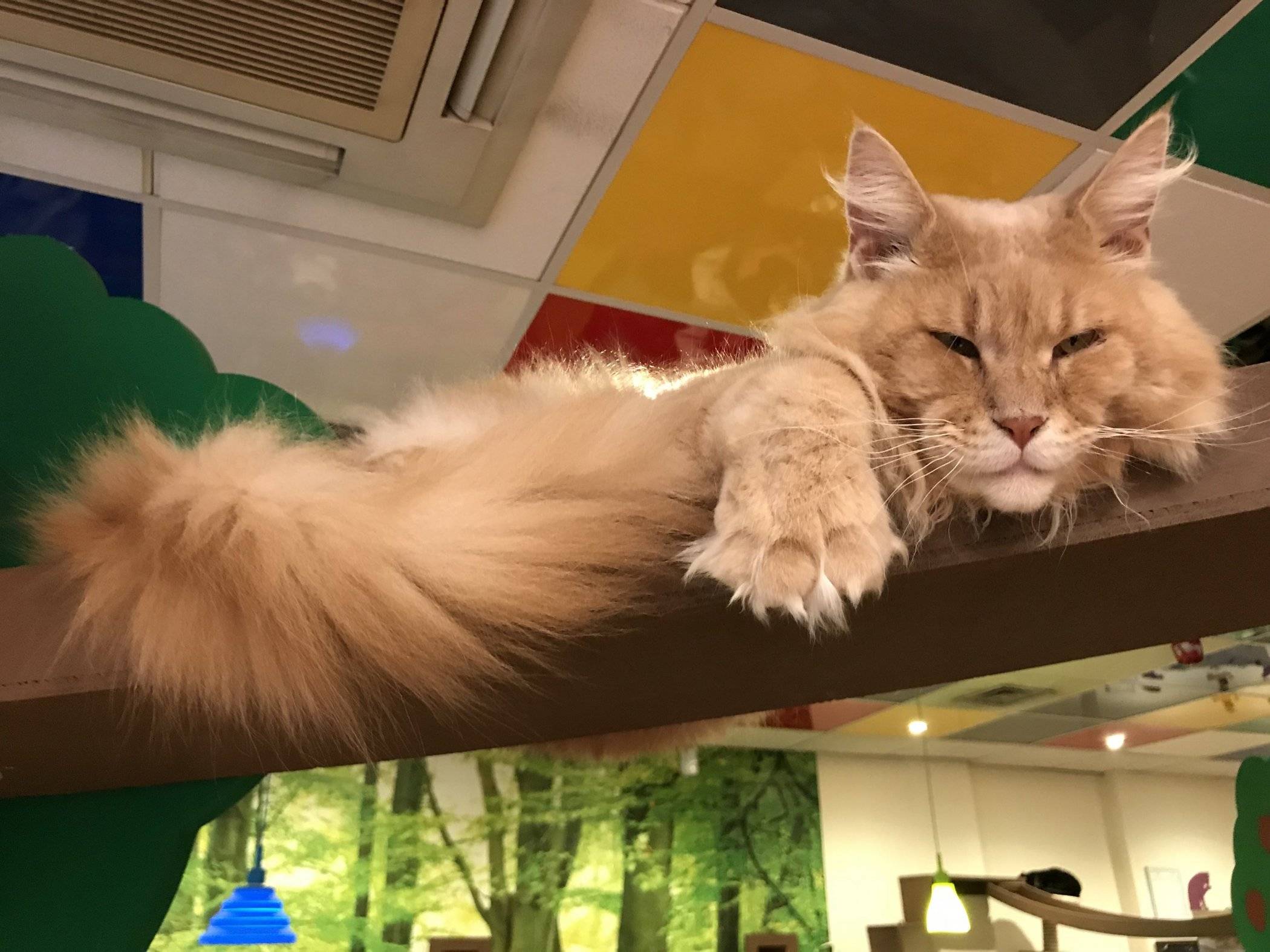 A seasoned cat cafe veteran, I found myself in the strange position of not knowing what to do. Yes, the facility is nice, clean and comfortable. Yes, the staff are friendly. Yes, there is a large menu of delicious food and drink to choose from. And, yes, there are many, many cute kitties, especially Heathcliffe, an enormous ginger with paws so large, it suggests he might have a recessive lion gene!