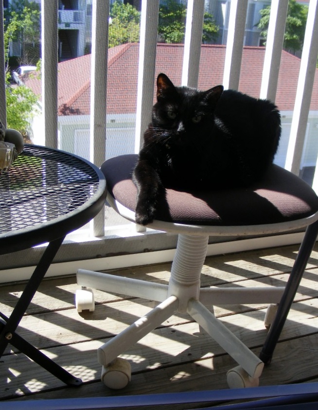 Shadow loved exploring our new home in Charleston, SC. exploring the closets and jumping on top of the refrigerator. She liked to go out on the screened balcony and look down from the third floor at neighbors. She continued to climb “her” ladder, which I kept in the living room and she also continued to get into a closet and bring me a pair of socks.